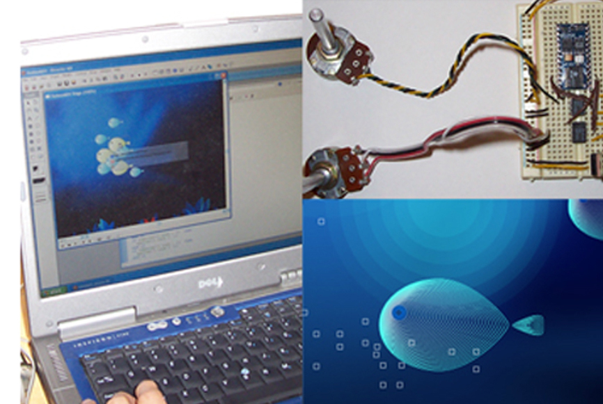 - Pressure sensors on the glass-top bar interact with the fish tank projected animation